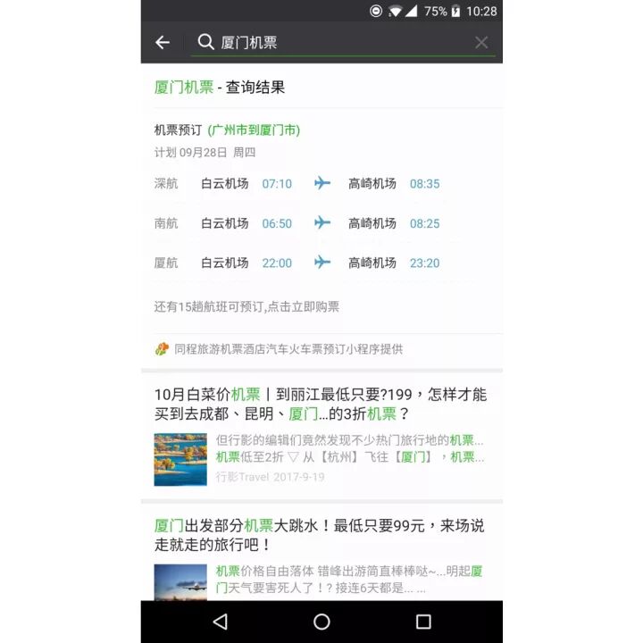 在搜索栏输入出发地到目的地+汽车票/船票/机票,会直接展示相关的查询结果,点击即可直接进入同程的小程序购买。