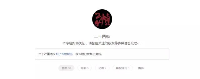 知乎专栏“二十四帧”的首页,目前该专栏已被禁止更新,最后一篇文章更新于两年前。图片来源于网络