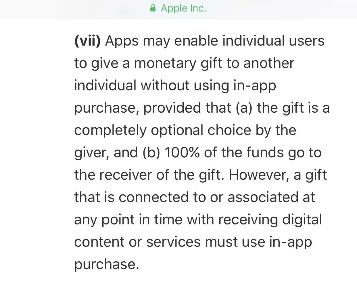 果然,9月中旬,Apple在原来的《App Store审核指南》第3.2.1条,即“可以接受”条款之下,增加了第七点,首次明确,app可允许个人用户使用非app内购买项目机制向另一位个人送赠货币式礼物,前提为:a) 送赠方拥有决定是否进行送赠的完全自主权,b) 获赠方收取100%的礼物金额。然而,礼物若在任何时间点对应或包含接收任何数字内容或服务,则必须使用app内购买项目。
