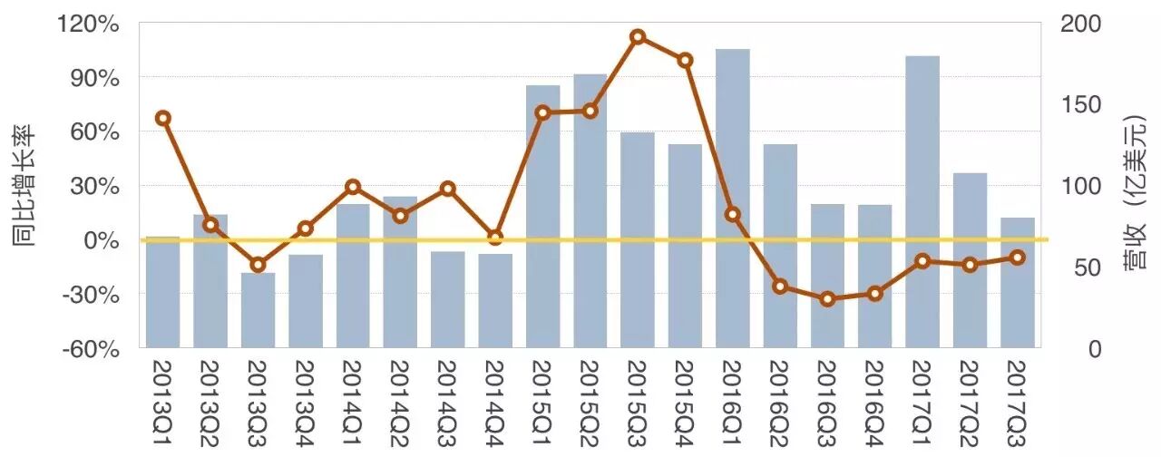Apple自2013年至今大中华区的季度营收(亿美元)和同比增长率