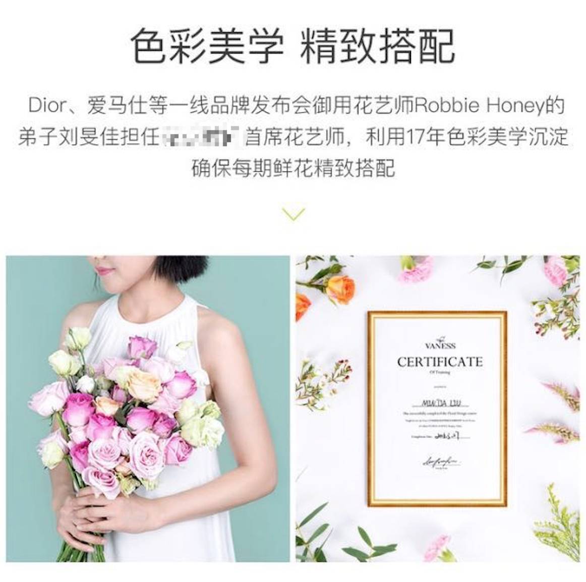 没错,这个品牌的花艺师,不过是Dior花艺师的弟子而已,在业内人士看来,不就是弟子吗?又不是本人,有什么了不起?但是,我们必须知道,顾客是匆匆滑屏地看页面,由于他的浮躁,他往往会记住大牌,而忽略”弟子“,最终结果呢?他感觉你挺厉害的,因为你用了大牌设计师!