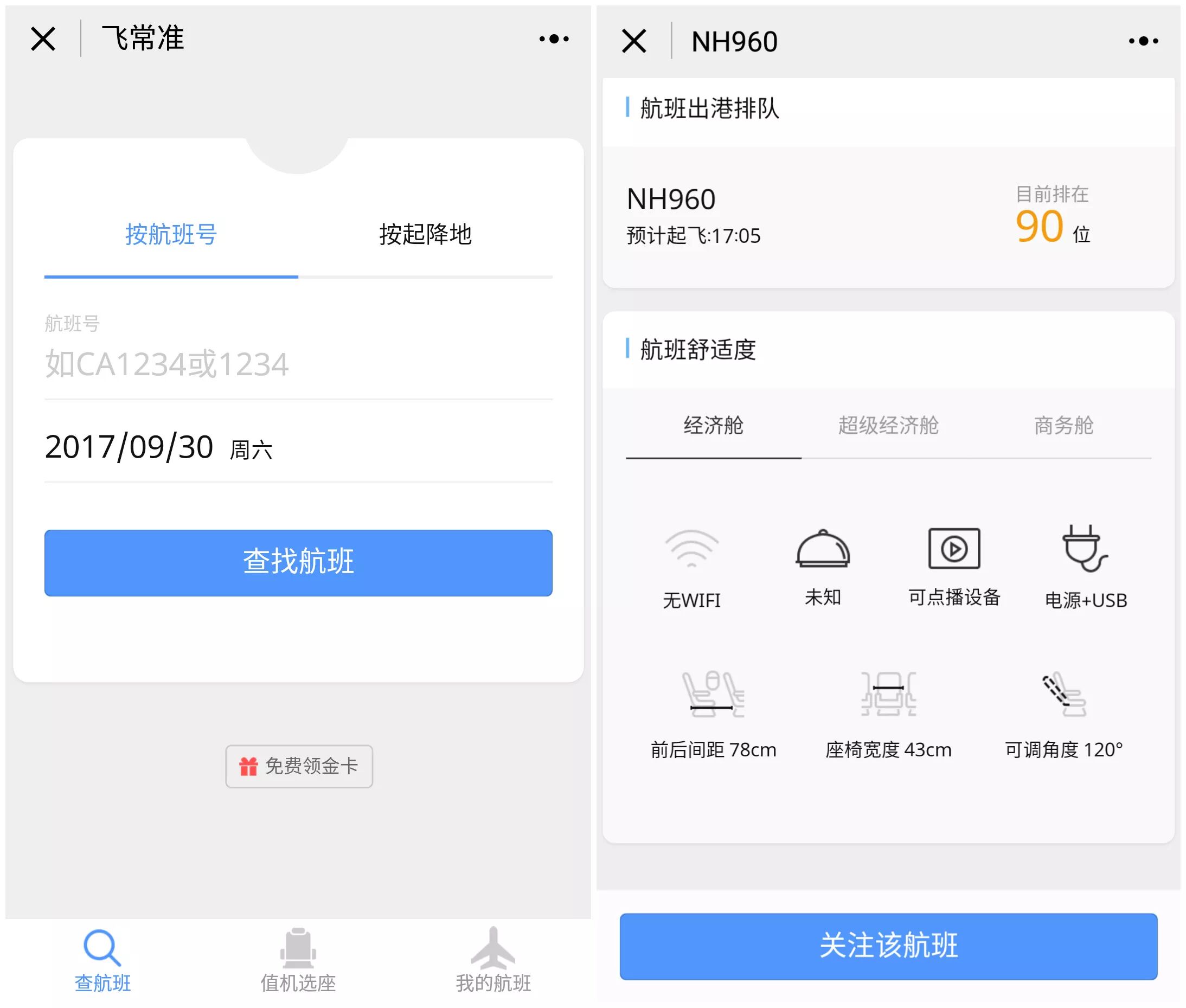 小程序“飞常准查航班”能帮助你精确查找航班信息,连有没有餐点和电源,座椅宽度,降落地天气都能找到。可以说是飞行必备了!