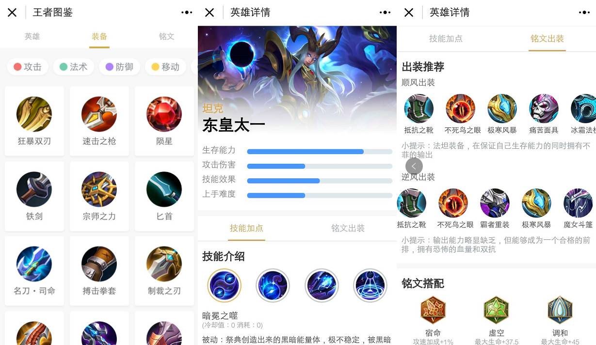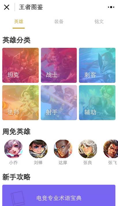 你可以在这里看到关于角色、出装和铭文等信息,还有详细的“电竞专业术语”供你学习。打开小程序,主要分为三个板块“英雄”、“装备”、“铭文”。