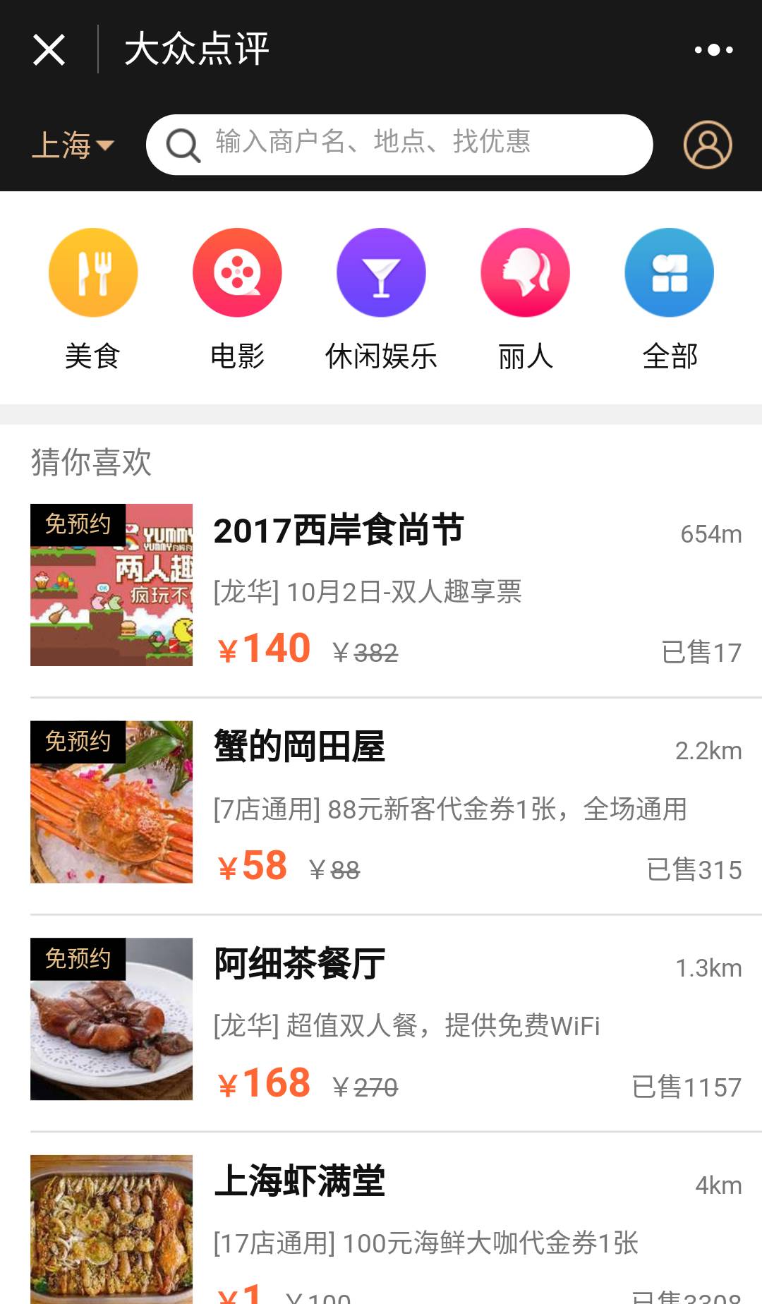 打开小程序,“大众点评”会根据定位,为你推荐一些美食和活动。你也可以根据自己的需要,搜索商户名来查找。
