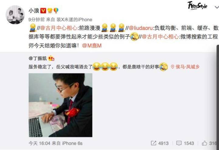 微博原有系统架构已无法满足业务快速发展及峰值应对,为此,微博对原有系统做了升级改造,但是,昨天又崩了。网上爆出微博的工程师为了维护系统,专门从婚礼上跑到电脑前加班,处理BUG,好了之后才返回婚礼现场。