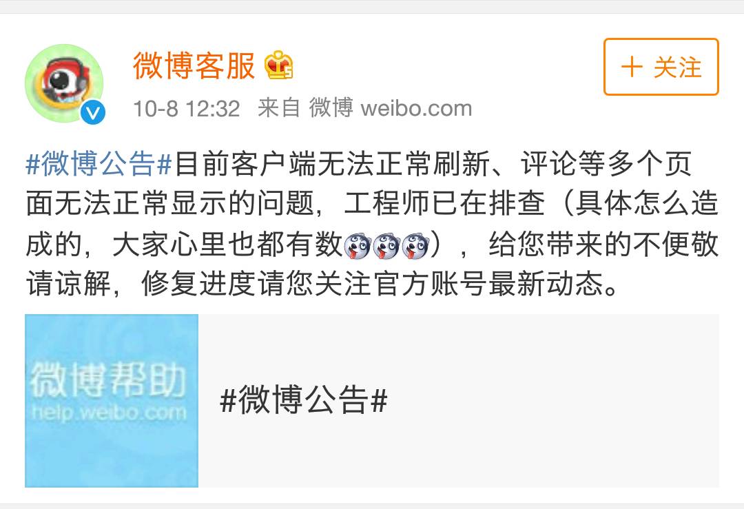 微博官方当即发布说明:目前客户端无法正常刷新、评论等多个页面无法正常显示的问题,工程师已在排查(具体怎么造成的,大家心里也都有数)。