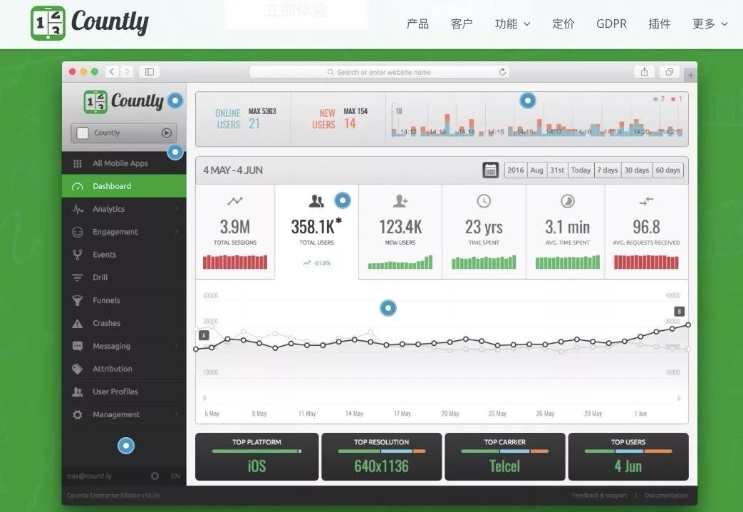 Countly是一个开源的实时移动应用分析平台。从移动设备收集数据,然后可视化这些信息来分析移动应用程序的使用和最终用户的行为。支持事件跟踪,几乎每个用户操作行为都可被跟踪,包括应用付费、广告点击等。Countly不仅支持iOS、Android、Blackberry,还支持Appcelerator Titanium和Uniy3D SDK。