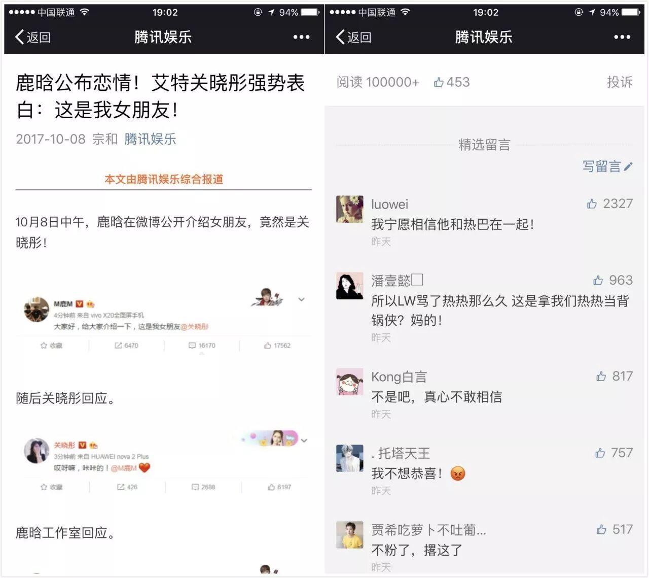 比如推文最早的“腾讯娱乐”就是放了几张微博截图,而紧随其后的“腾讯视频”则加上了鹿晗和关晓彤此前一些疑似暧昧的互动细节。官方号的可信度高,阅读量自然蹭蹭上涨。