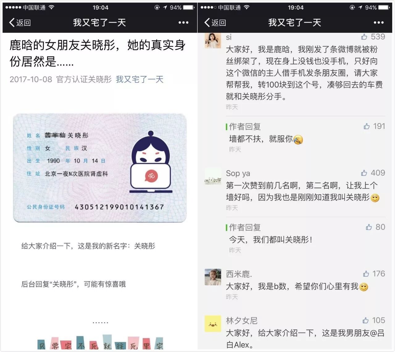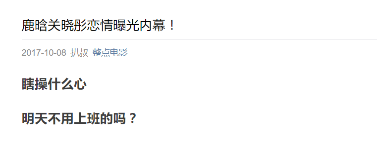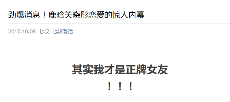 此外,不少只有一次推送机会的账号也选择了少信息量的跟进方式。只不过“腾讯娱乐”的少信息量重在“给实锤”,后者在于“抖机灵”。比如“我又宅了一天”,当天推文《鹿晗的女朋友关晓彤,她的真实身份居然是……》,实际内容是: