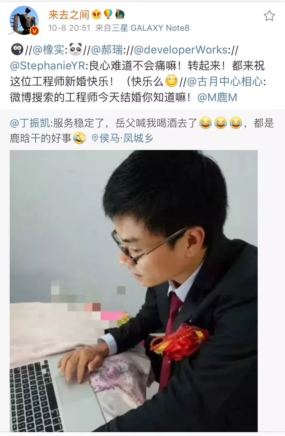 微博搜索的工程师小哥只能从自己婚礼上抽身出来,抱起笔记本电脑加班,让吃瓜群众心疼不已。
