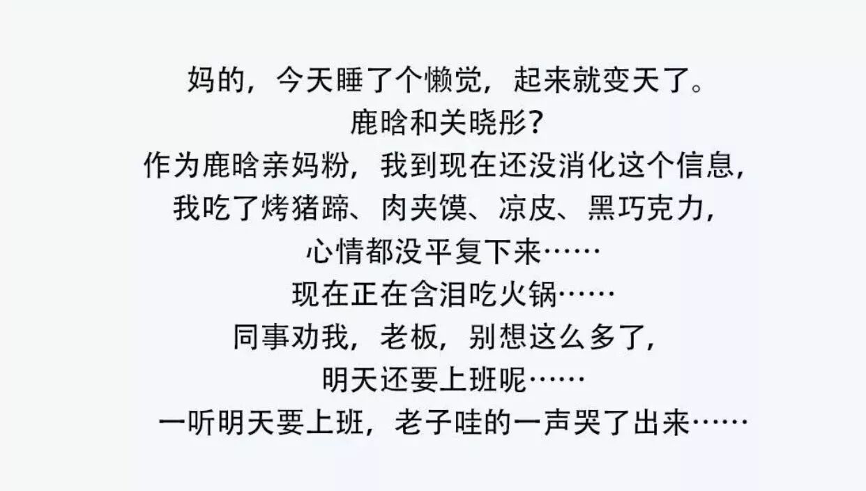 而对于一些鹿晗粉编辑来说,这个消息还是比较残忍的。咪蒙昨天在公众号里也说,自己得知消息无法消化,正在含泪吃火锅……