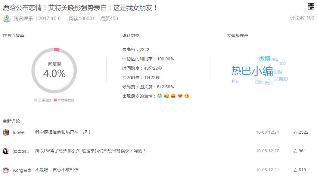 最早推文的是“腾讯娱乐”,在12:20首发了该事件的报道,阅读量已达10w+,点赞453次。评论区中被顶得最高的一条是:“我宁愿相信他和热巴在一起!”,获赞2322次。使用新榜评论采集功能分析发现, “热巴”被提及的频率很高,热门评论几乎都显示出震惊、不相信的态度。