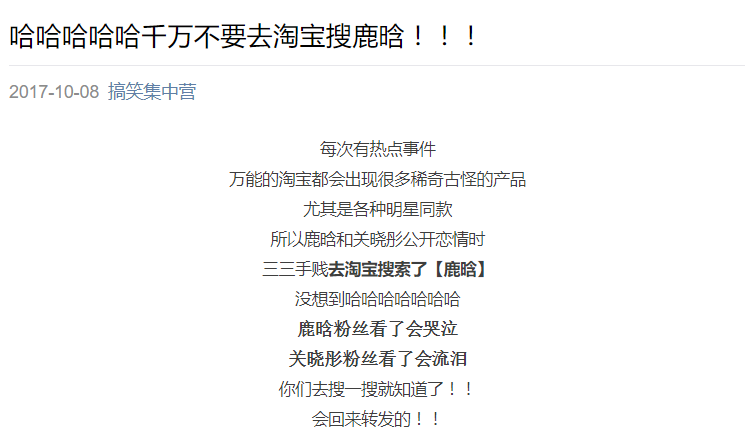 “做这行每逢佳节就怕明星出幺蛾子,好不容易挺过7天半,结果最后还是没挺住。我恨他们毁了我的假期!就怀着怨气和单身狗的愤怒想蹭下热点,想了几个方向吧。比如高价回收北京户口、关晓彤和鹿晗喜欢什么体位之类的。哈哈哈因为我们的号有一点污,主要怕鹿粉受不住,写还是能写的,毕竟我写黄文是强项
