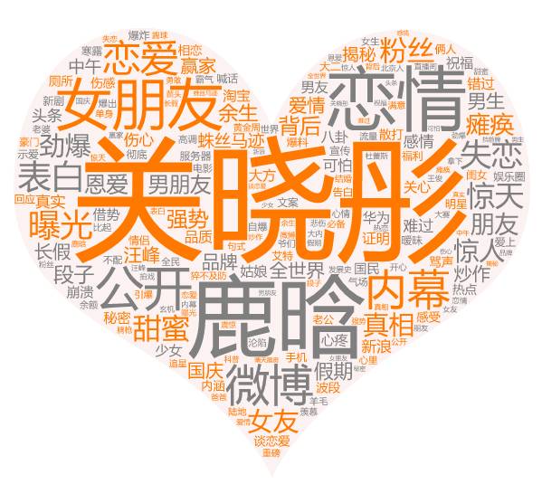 在相关文章的词云图中可以看到,大家的关注点除了事件主人公,微博、恋情、女朋友、恋爱和公开等词外,曝光、惊天、劲爆、内幕、失恋等词也比较“扎眼”。