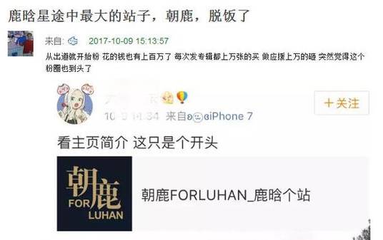 今天下午,“朝鹿”登上微博热搜,据说疑似脱饭、关站。“朝鹿FORLUHAN_鹿晗个站”作为鹿晗最早一批个站,拥有44万粉丝,曾花百万为鹿晗应援。微博还停留在10月6日,评论已经被鹿饭们攻陷。