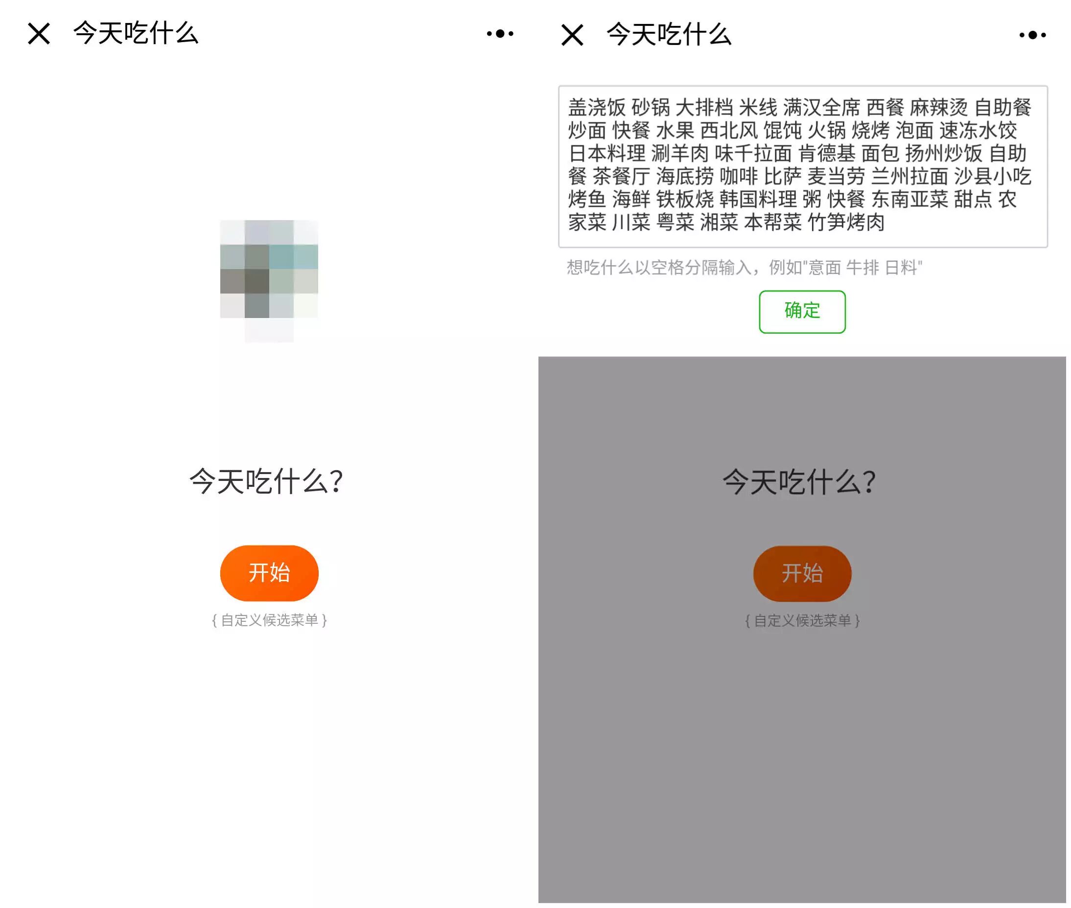 “今天吃什么”的功能就和名字一样,能帮助你决定今天吃什么。首先,可以点击“自定义候选菜单”,输入你想吃的菜,以空格分隔输入。