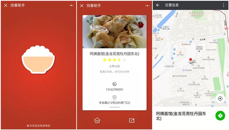 打开“找餐助手”,点击饭状图标,小程序会根据你的实时位置,随机推荐附近的餐厅。点击餐厅图片,会出现餐厅的位置信息,可以直接导航前往。