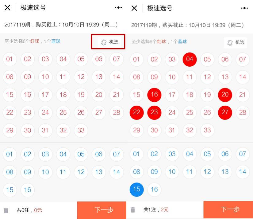 别慌,点击“机选”,瞬间就选好啦!点击下一步,可以看到投注号码、投注金额、开奖时间等信息。
