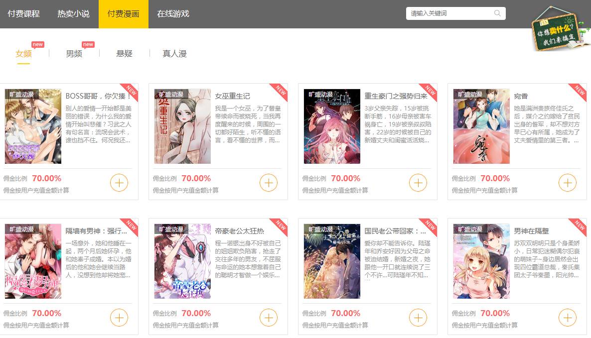 与小说分销一样,漫画分销提供优质文案、高分成、锁粉功能,分销操作步骤和结算规则也完全相同。