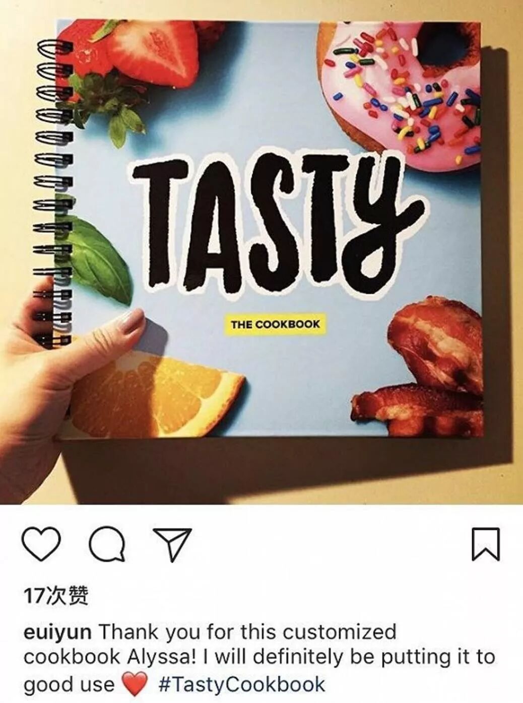 另外针对喜欢在社交媒体上晒DIY美食的年轻人,Buzzfeed还推出了一个美食品牌Tasty。它用高颜值的方式拍摄了许多适合在Instagram和Facebook上观看和分享的美食教学视频,同时还开发了一系列美食产品,其中最受欢迎的是一本可以让人们自己定制的食谱书。除了产品收入之外,推出一年不到的Tasty品牌已经吸引了许多食品公司和零售商做内容植入。