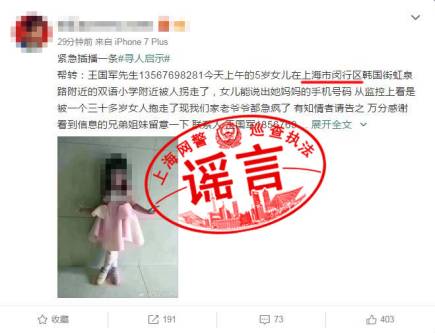 据网信上海 经上海市公安局网安总队会同闵行公安分局查证,任某(女,29岁)、陈某花(女,28岁)、陈某燕(女,35岁)3人在未经甄别信息真实性的情况下,先后在网上散布“闵行5岁小孩被拐”的不实信息。