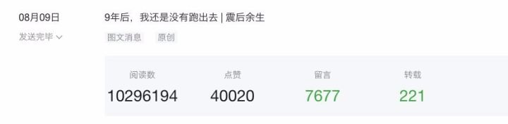 8月9日,九寨沟发生7.0级地震。新世相的推文《9年后,我还是没有跑出去 | 震后余生》获得微信1029万,今日头条318万的阅读量。9个汶川地震的生还者的故事,组成了这篇文章。