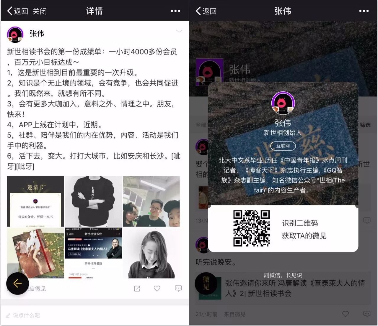 昨天,在“新世相”重生两周年的当天,新产品“新世相读书会”上线。这个知识付费平台,被创始人张伟称为“新世相目前为止最重要的升级”。他在朋友圈透露,读书会上线一小时售出4000份年卡,销售额破百万。新世相读书会App,也将于近期上线。