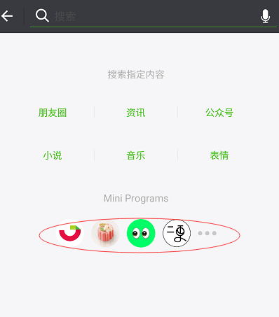 在微信搜索框下方,向所有使用过小程序的用户,提供了小程序的快捷入口。用户点击小程序 Logo 后,可以直接打开对应的小程序。