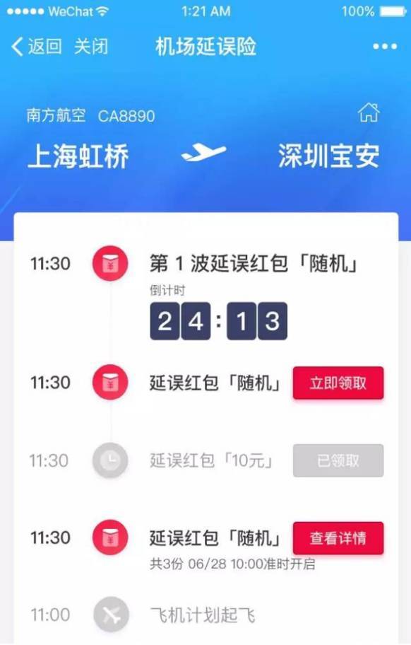 根据时间不断变化的随机红包。只要购买延误险的用户,每延误30分钟,用户就能收到1个延误红包。这样不仅让用户减少等待飞机时的焦虑,还能让整个过程充满趣味甚至是期待感。