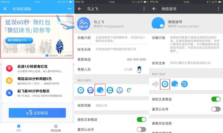 为了让更多用户感受到更加流畅的产品使用体验,增加复购率,众安保险的服务号“马上飞”和微信读书服务号在活动期间分别互相绑定了对方的小程序,以便在各自的公众号内进行文章互推。