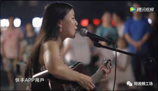 在建筑工地一边工作一边唱歌的工人、在公交车上戴着耳机看着窗外唱歌的少年、抱着吉他在街上忘我唱歌的女孩......如果视频中没有“快手APP用户”的字眼,我们不会认为这些短视频是广告;