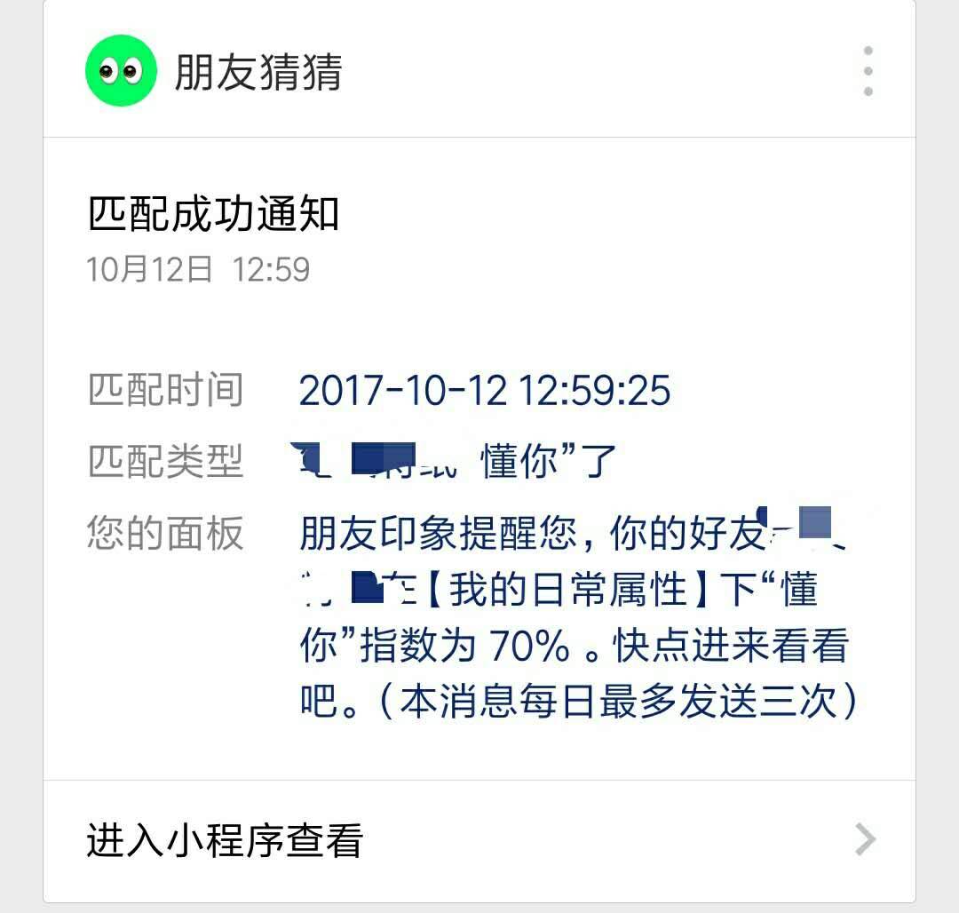 栗浩洋:我们主要使用小程序自带的“模板通知”功能。会制定严格规则,避免频繁推送打扰用户。比如“朋友猜猜”小程序,一旦有好友做完你的“题目”,你就会收到不超过三条的“匹配通知”。也可以把用户引导到App和公众号上,通过其它渠道推送。目前,我们的几款小程序次日留存有40%~50%,月留存在20%左右。