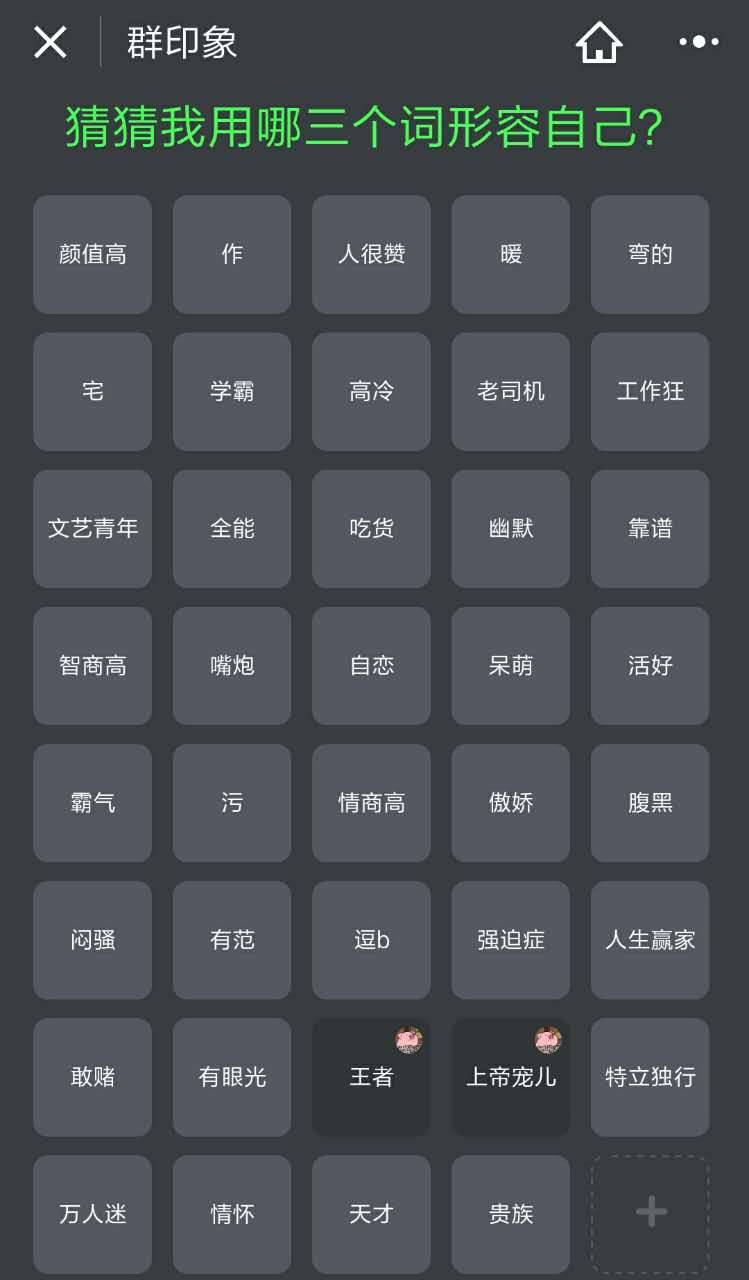 “群印象”是一款帮助用户收集群友印象的小程序。用户可知道“自己眼中的自己”和“他人眼中的自己”。这是继“匿名聊聊”被封后,“朋友印象”团队上线的首款小程序。栗浩洋称,这款“让人更真实地认识自己”的小程序,7天就累积了350万用户。