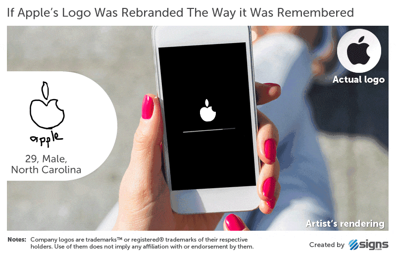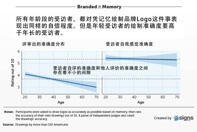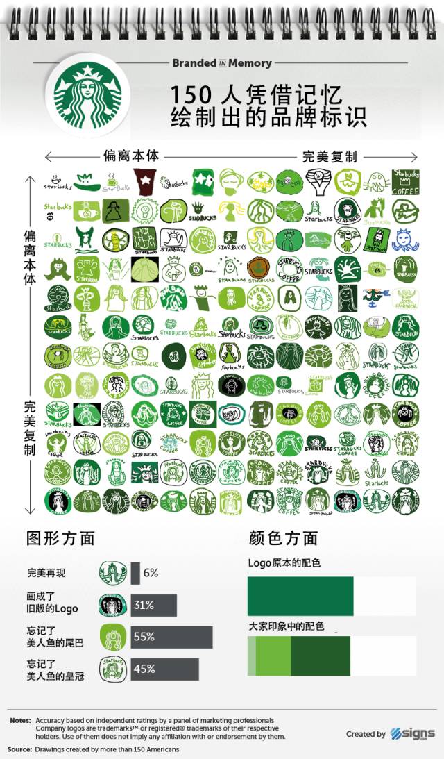 美国设计公司Signs采访了150多人,邀请他们尽可能准确的画出记忆中的10个著名品牌Logo。从1500张、总耗时达80小时的画作里,总结出了一些有趣的数据。