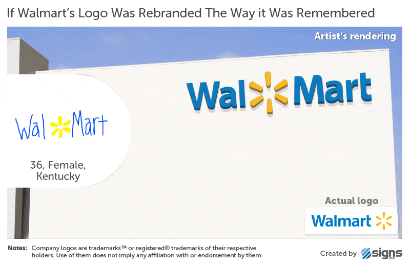 2008年开始,沃尔玛为了让标识显得更为友好,取消了连词符,并且加入了太阳的象征符号。有68%的人记得那个太阳符号,但是只有其中42%的人记得是6个小点,并且把这些小点的位置摆放正确。