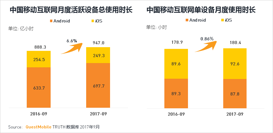 新榜讯 10月18日,数据公司QuestMobile公布2017秋季报告。报告显示,移动互联网用户量增长乏力、月使用时长、日使用时长进入停滞。相比去年9月,iOS设备量也出现下滑。