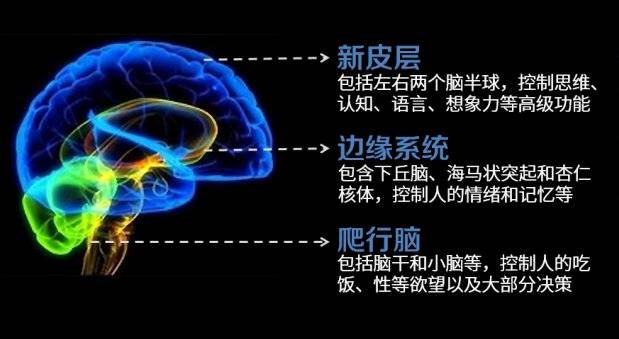 爬行脑——原始大脑,控制人的吃饭、性、享乐等几乎所有欲望和本能,也掌管着人类大部分的决策。它是愚蠢、冲动、缺乏远见并渴望立刻满足的。