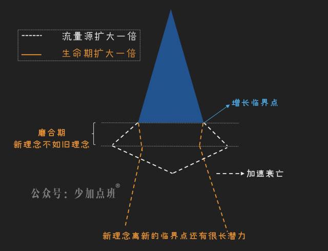 用户增长达到临界点之后,紧接着是“加速”衰减(注意:是加速不是匀速),所以上图的边缘理论上都是圆弧,而不是直线(知会即可,懒得画了)。