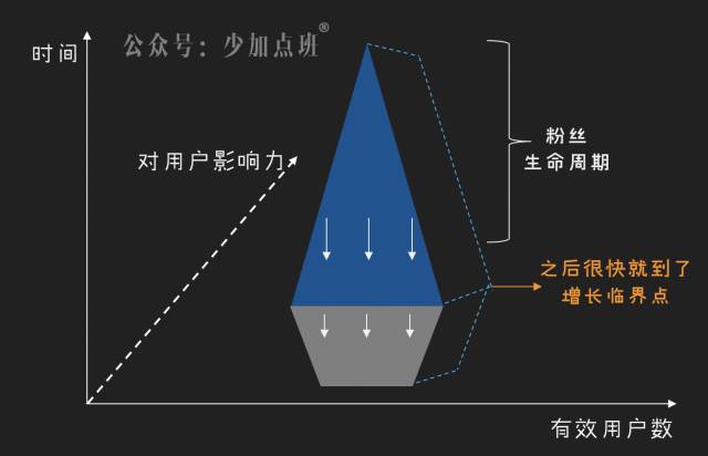 毕竟,一旦产品运营期到了用户生命周期后,实质上就开始出现大量用户流失的情况(哪怕他们暂时没有点击“取关”);换句话说,一旦到了粉丝生命周期的时候起,基本上不用多久就会达到用户增长临界点(在人口基数没有大变化的情况,没有产品能够长时间维持加速增长)。