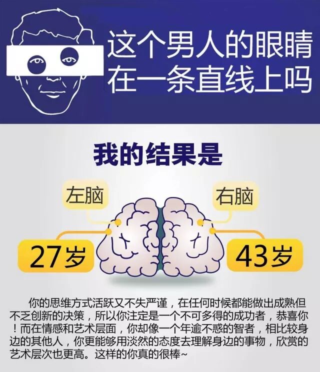 作为朋友圈最新热点,左右脑年龄测试很简单。只要通过扫描测试结果图中的二维码并回答几个设定的问题后,便会生成一张显示有左右脑两个年龄测试结果的图片,图片的下方还配有相关的文字解释。
