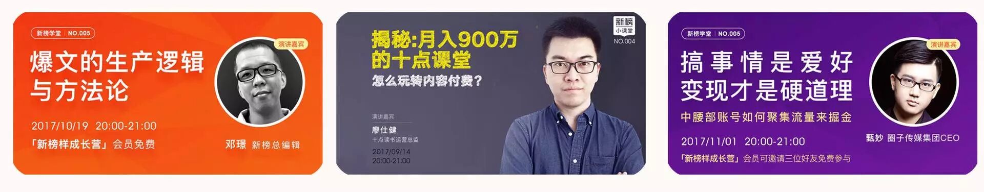 新榜为成长营会员准备了全年的课程,每月2期,期期都是精心打磨的精品。(导师团包含徐小平、罗振宇、吴晓波、吴声等大咖)会员还可免费邀请3个好友一起听课,给予身边的朋友实打实的福利。