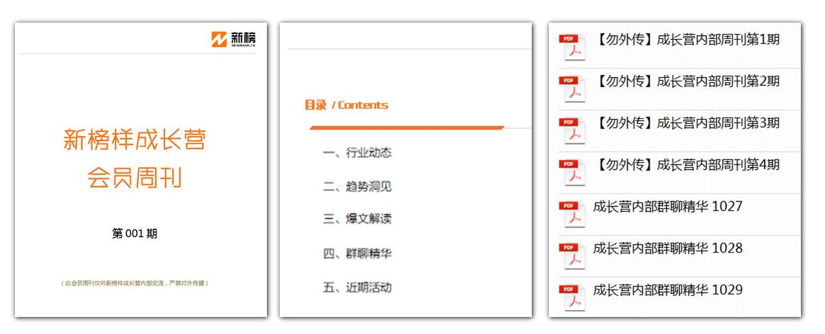 成长营每周都有会员周刊,新榜网罗了你最不该错过的行业资讯,并附带了内部的点评和洞见。(只对少数人讲的那种,2分钟就能读完,足够精炼,足够干货!)