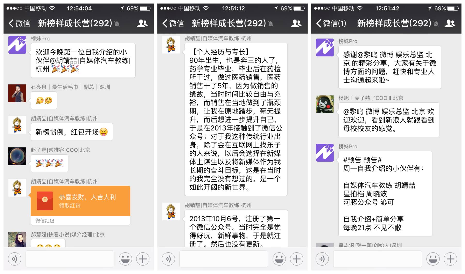 每晚9点是成长营分享和介绍的时间,每次三位会员,每人5分钟分享,每一位会员都可报名群内的自我介绍和分享,寻求合作的机会,优质资源先对接。
