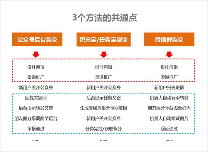 至于是利用公众号后台、积分宝/任务宝还是微信群,这只是方法的不同,提高裂变的效率。
