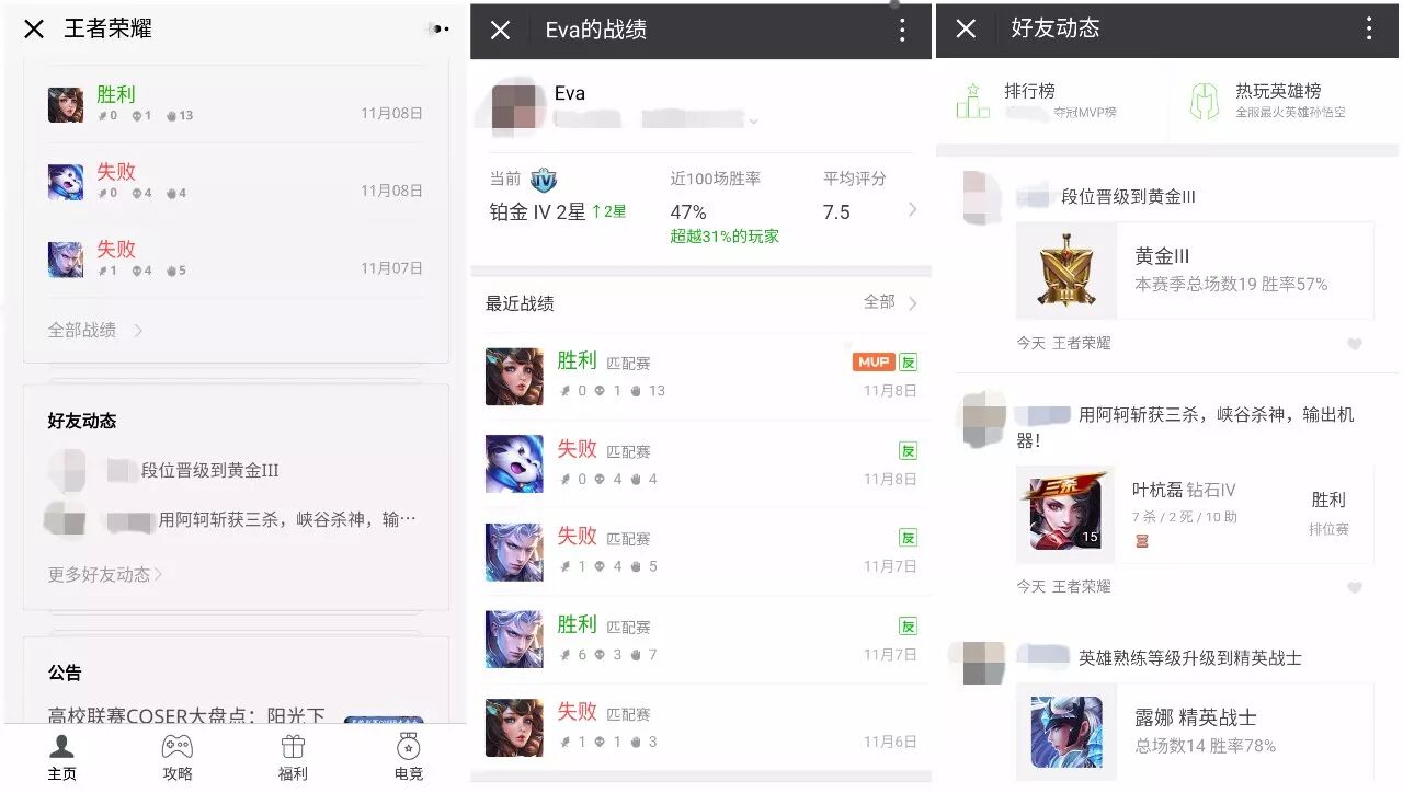 在小程序“王者荣耀”的主页,点击“全部战绩”或“更多好友动态”都将跳转至相应的网页。