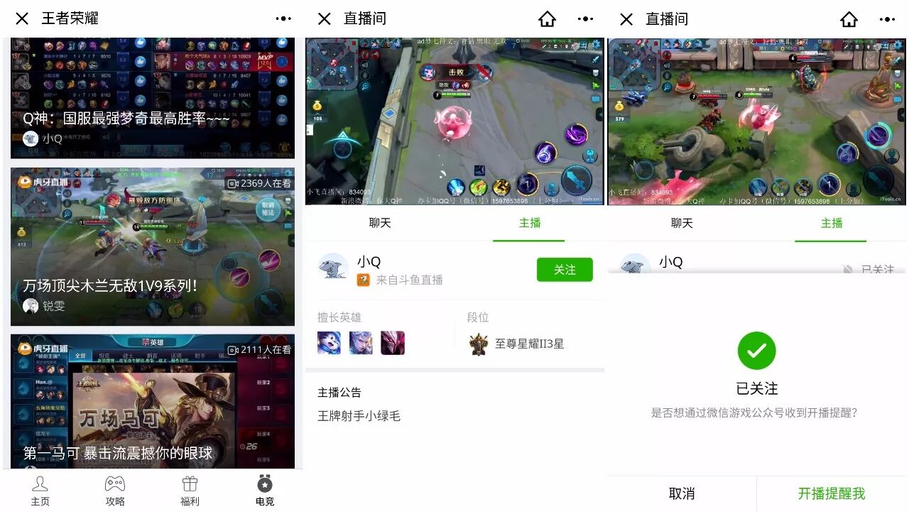 除了跳转到网页,点击任何电竞版块的内容,都会跳转到小程序“微信电竞”,进入相应的直播。在这个页面还能看到实时聊天,主播来自的平台、擅长英雄和段位。选择关注主播,还会提醒用户“是否想通过微信游戏公众号收到开播提醒”,实现公众号和小程序的联动。