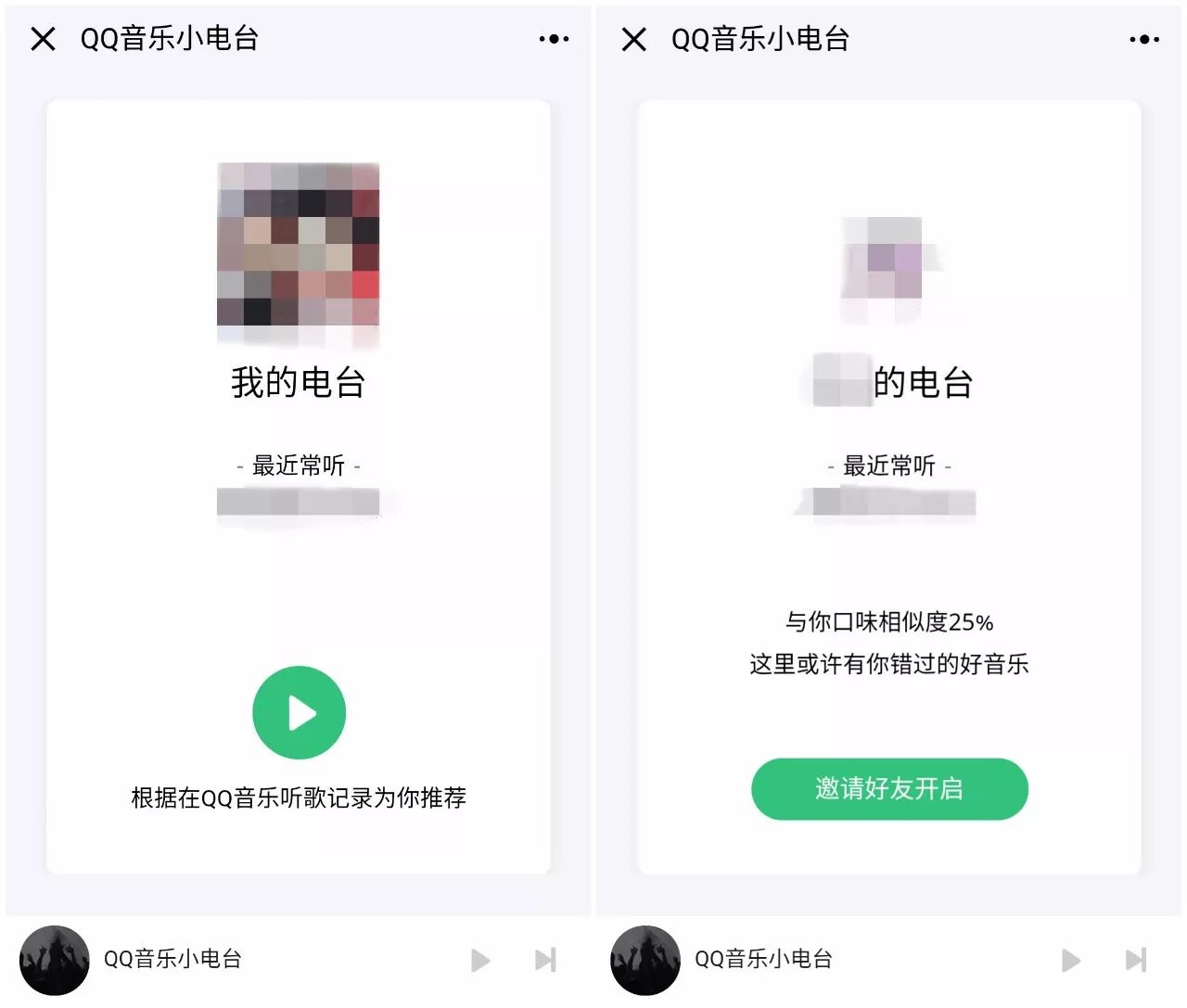 “QQ音乐小电台”会根据用户在QQ音乐的听歌记录,推荐歌单。向右滑动还能看见好友的电台,了解他最近常听的歌曲类型,与自己口味的相似度。