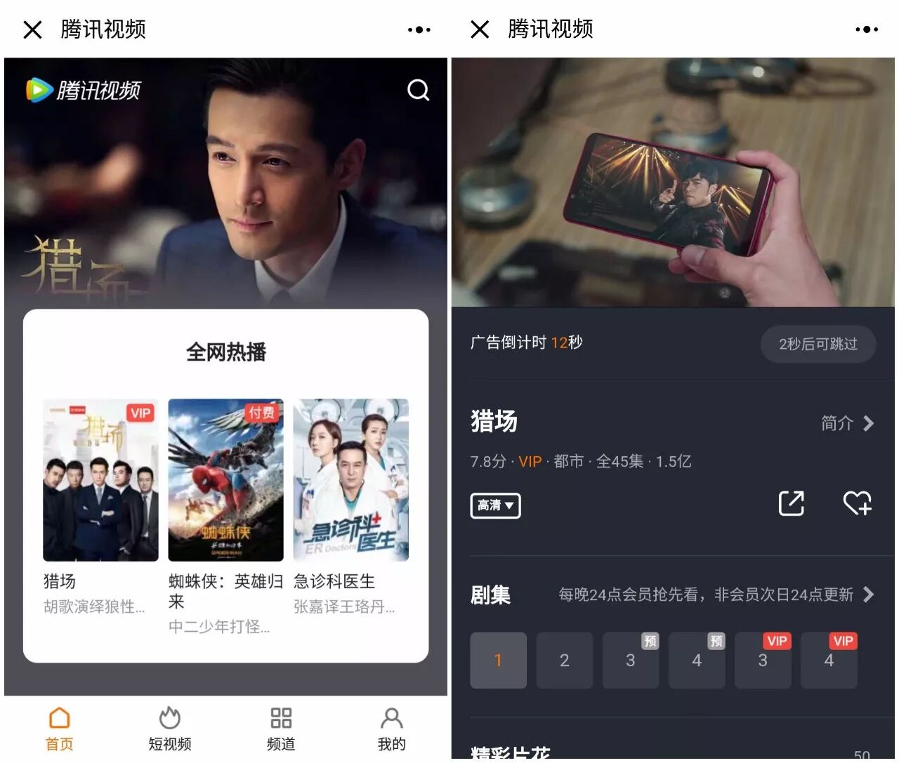 “腾讯视频”的首页将视频编为2-4个一组,有主题地呈现。用户向右滑动,可以发现更多主题。点击进入任一视频,也能观看。(榜妹悄悄告诉你:广告只有15秒,还能跳过……)
