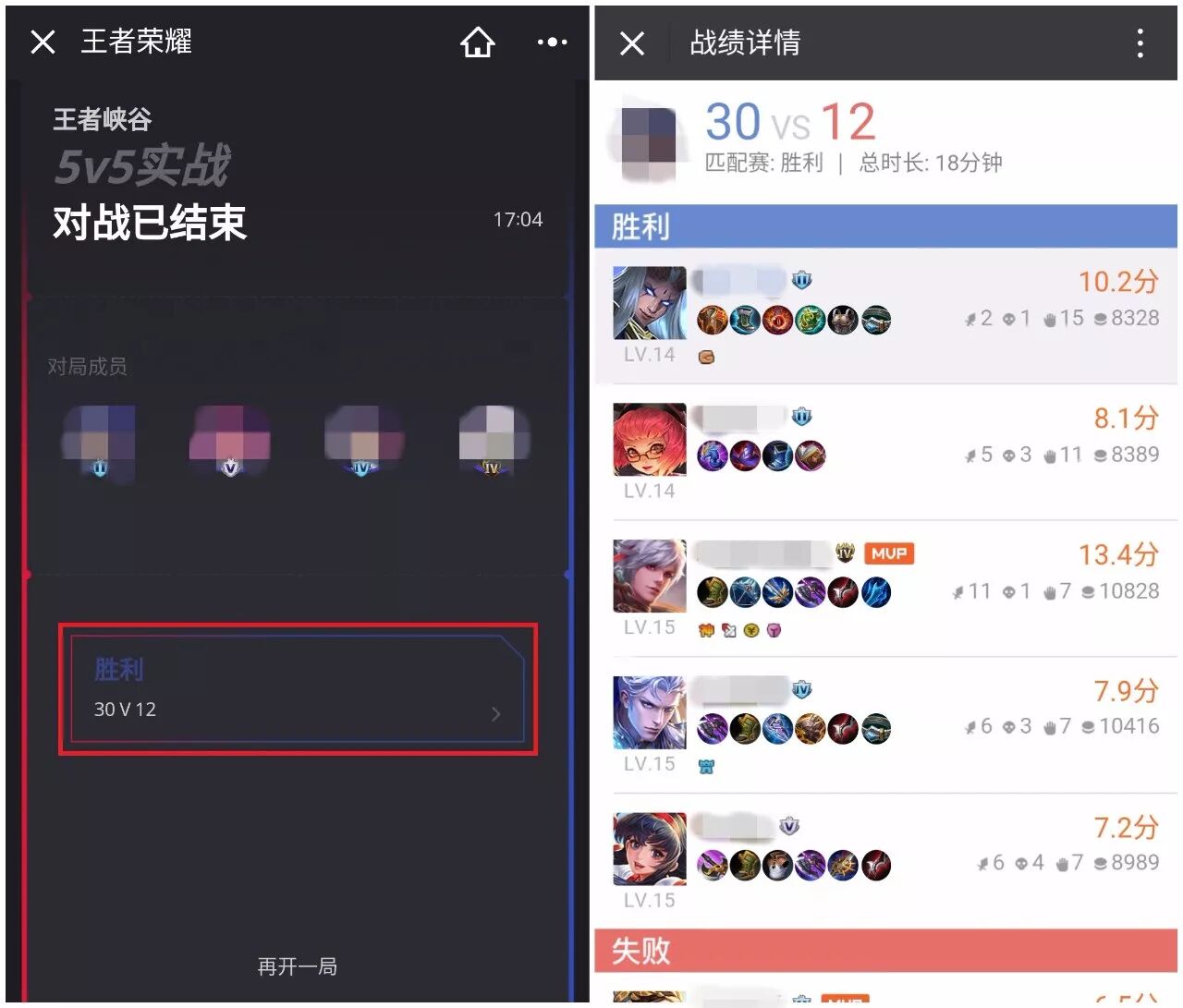 比如,游戏结束后,再次点击进入邀请链接时,页面显示“对战已结束”,点击战绩“胜利 30 VS 12”,会跳转至战绩详情的网页。