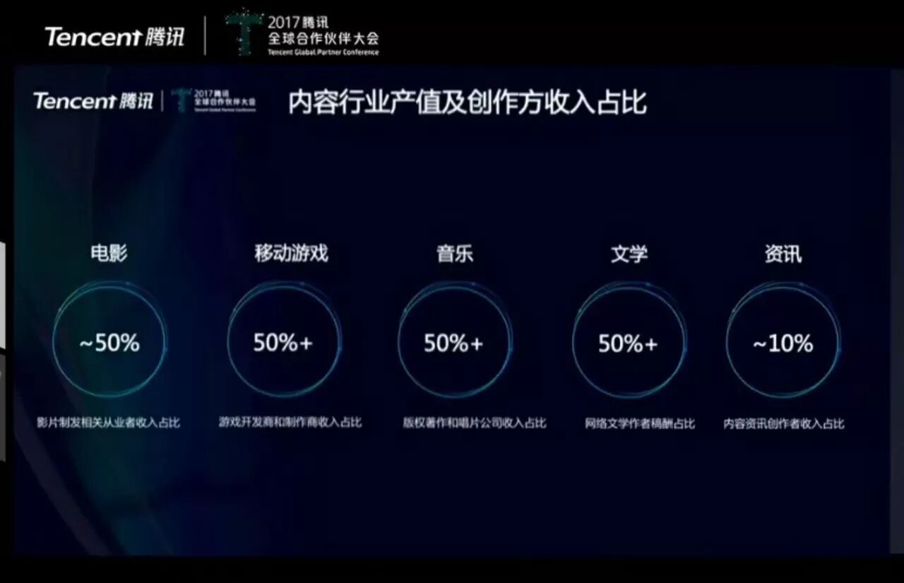 腾讯副总裁林松涛演讲的一页PPT,中午在内容创作者的朋友圈引起了小刷屏。这张图显示了“内容行业产值及创作方收入占比”:电影、移动游戏、音乐和文学领域中,创作者收入占比都在50%上下,只有资讯占比在10%左右。